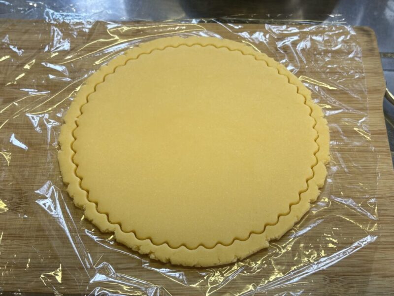200gのお団子(最後にフタになる部分)を長めにとったラップで挟み、まな板プレス→お尻プレス→ルーラー(厚み調整ガイド棒)で5mm厚の円形→タルト型で型抜きし、ラップで包んで冷蔵しておきます。