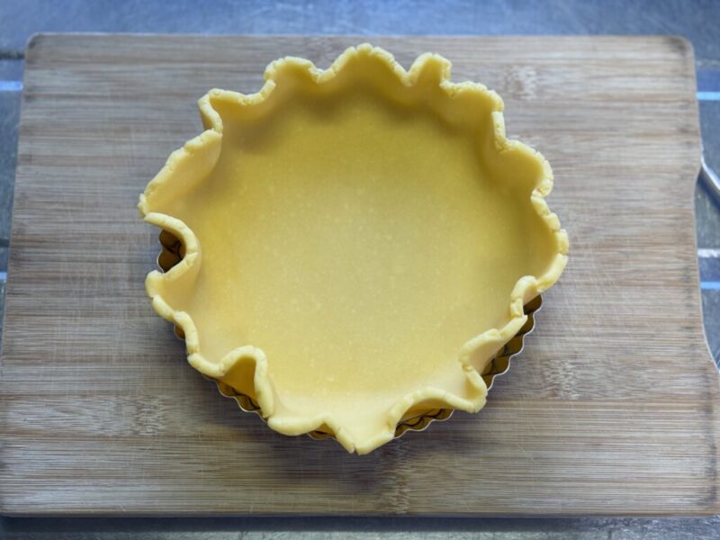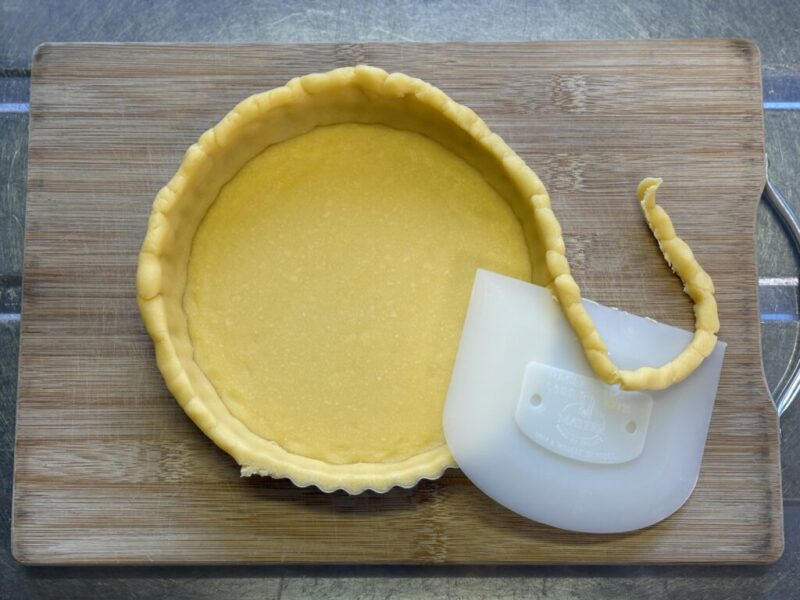 同じように、300gのお団子(タルト型に敷いて底になる部分)を、5mm厚の円形→タルト型に敷き込み、カードで縁からはみ出た余分を切り落とします。