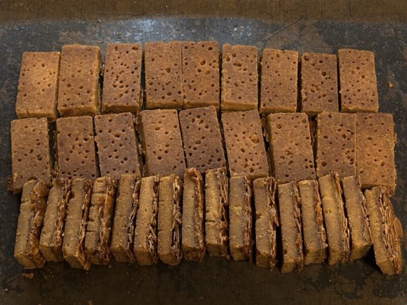 2020年以前、焼き上がった後の飴がけの部分の硬さをもっと軽くしようとして色々試作していた時、ピケをたくさん打ち込むことによって、その穴の中に飴がけの部分が入り込んで、硬い食感が多少やわらぐような気がしたという おぼろげな記憶があって…。