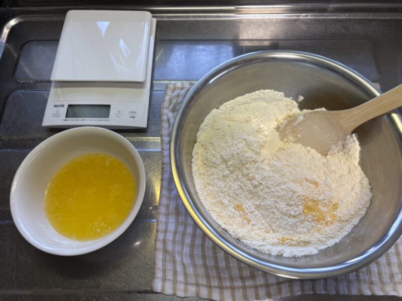 丁寧に作りたい方は、この後に麺棒で延ばして切って重ねる工程を3〜4回繰り返す伝統的な作り方の工程を入れてみて下さい。ただ、前回の製法であるサブラージュ法のように、固まった状態で細かく分散したバターと薄力粉の生地の層で持ち上げるのと違って、今回は、薄力粉に吸収されてしまった溶かしバターが層を形成することが難しく、あまり意味のない工程のような気もします。が、溶かしバターで作る方法でも、冷たい卵の中に ぬるい溶かしバターを先に混ぜて、ドロドロとしたバター半固まり状態の液体にしたものを、冷たい薄力粉の中に混ぜてまとめた後、さらに冷蔵庫でしっかりと寝かせてから折りたたむ工程を入れるなら、固まったバターが層を形成し持ち上げるのでは?と思ったりもします。もちろんベーキングパウダーの効果もあるので変化の違いがわかりにくいですが。