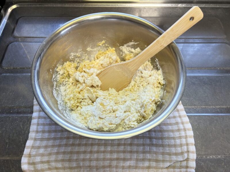 木べらが力が入れやすいので使っていますが、途中から手で混ぜていくのでゴムベラでも木べらでもどちらでもOKです。。