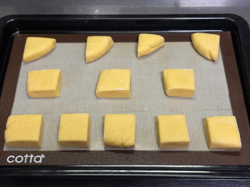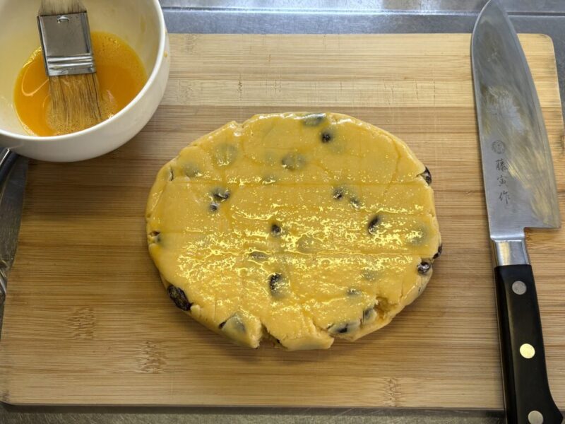 焼き色を綺麗に仕上げたい方はここで全卵をときほぐしたものを塗ってね。普通はカットして天板に並べた後に塗るけど、カットする前に塗るとラクです。
