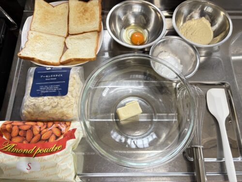 今回のスイーツは、食パンで作るクロワッサン・オ・ザマンド。