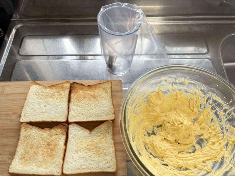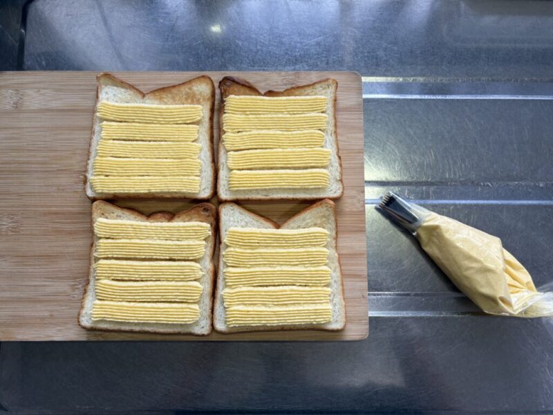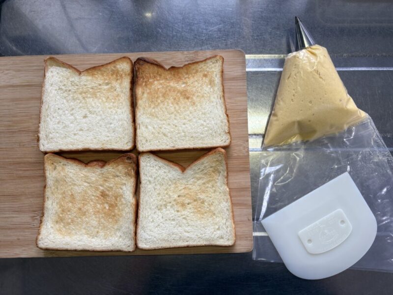 今回はシロップを染み込ませてしっとりさせるという工程は行わず、薄い食パンを使って、ラスク寄りのサクい食感を目指します。