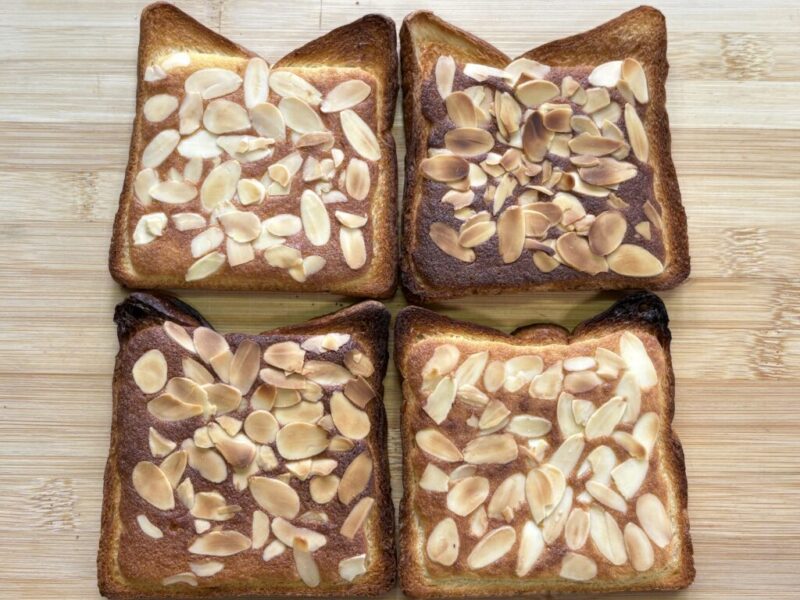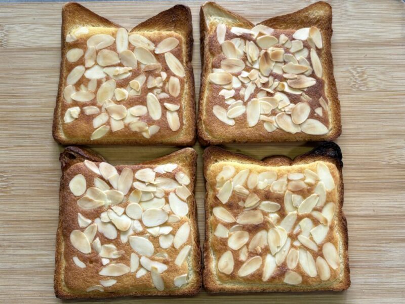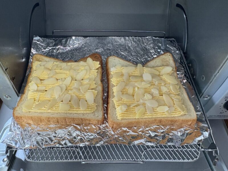 写真の色だとちょっと弱いです。アーモンドクリームを乗せた後は食パンの上面には火が入らないので、先にしっかりトーストしておきましょう。