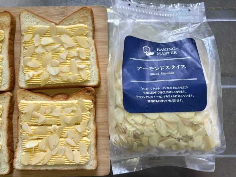 アーモンドスライスは小さめの食パンなら1枚につき5gほど。通常の食パン1枚なら7gくらいの量を使います。
